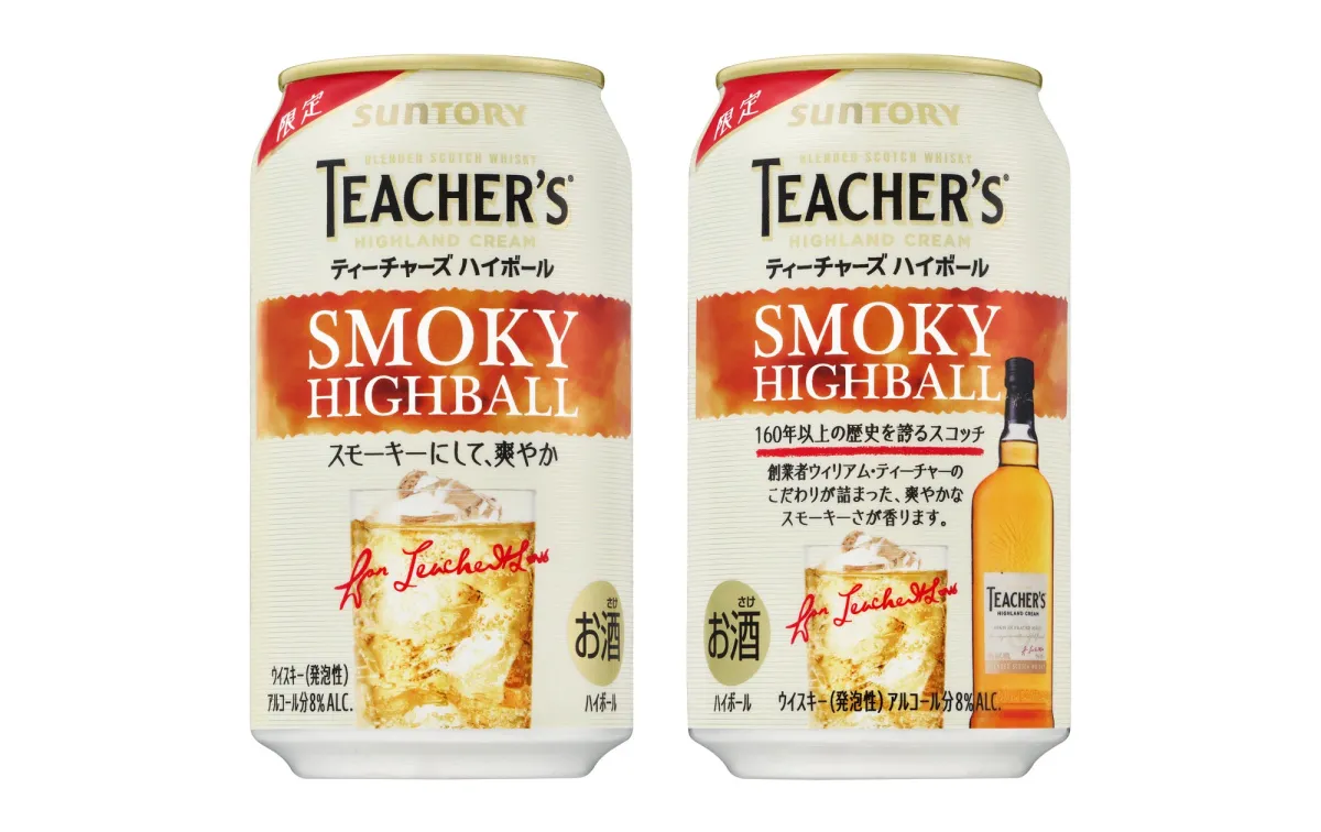 パッケージデザインも注目です。缶には、グラスに注がれたハイボールのイラストが描かれ、「SMOKY HIGHBALL」という文言が目を引きます。さらに、「スモーキーにして、爽やか」というキャッチコピーが、中身の特徴を強調しています。裏面には「ティーチャーズ ハイランドクリーム」の瓶のイラストもあり、本格的なスコッチウイスキーのハイボールであることをしっかりとアピールしています。