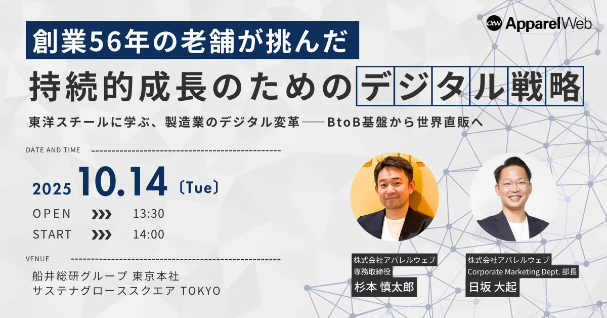 株式会社アパレルウェブが主催するセミナーが、10月14日(水曜日)に東京都中央区の船井総研グループ 東京本社にて開催されます。このイベントでは、1969年創業の老舗企業である東洋スチールが、持続可能な成長を目指すデジタル戦略の実践事例を紹介します。具体的には、BtoBビジネスを基盤としながら、ブランドの再定義やデジタル施策を融合させ、世界市場へと進出する新しい販売モデルへの転換について解説します。