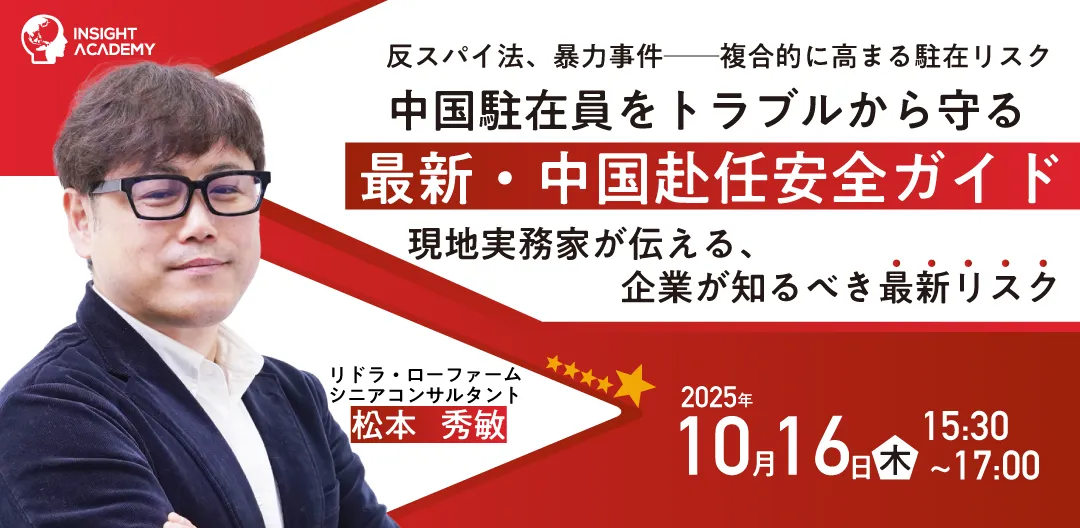 2025年10月16日(木)、インサイトアカデミー株式会社が主催するオンラインセミナーが開催されます。このセミナーは「反スパイ法、暴力事件──複合的に高まる駐在リスク 中国駐在員をトラブルから守る」と題され、特に中国での駐在を考える企業や個人に向けた重要な情報が提供されるものです。特に経営層や人事部門にとって、非常に価値のある機会になるでしょう。