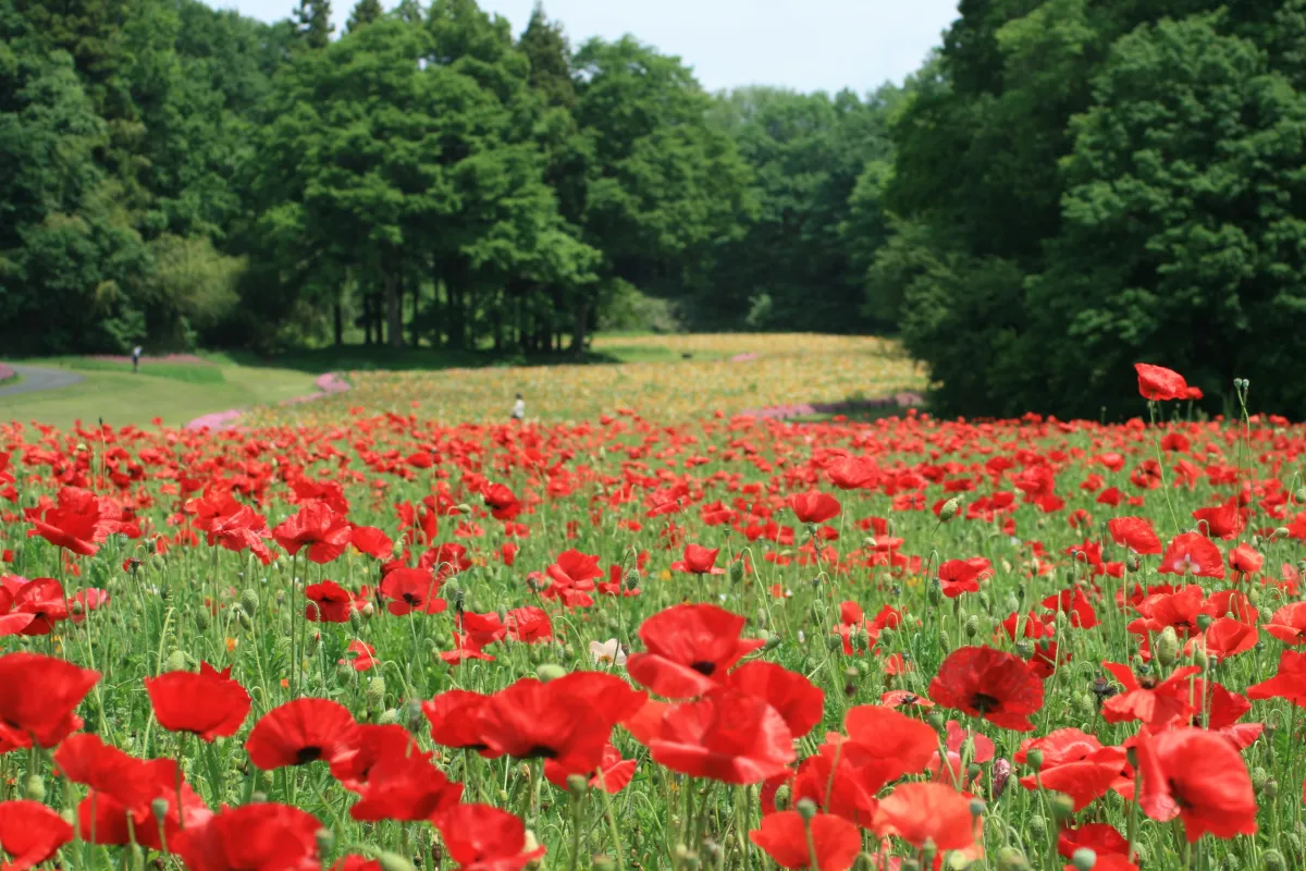 国営武蔵丘陵森林公園の運動広場花畑では、約30万本のシャーレーポピーが見頃を迎えています。例年通りの開花時期となっており、5月13日から25日頃まで楽しめると予想されています。ここでは、赤い花が一面に広がる風景を体験でき、観光客や地元の方々が訪れて美しい光景を楽しんでいます。