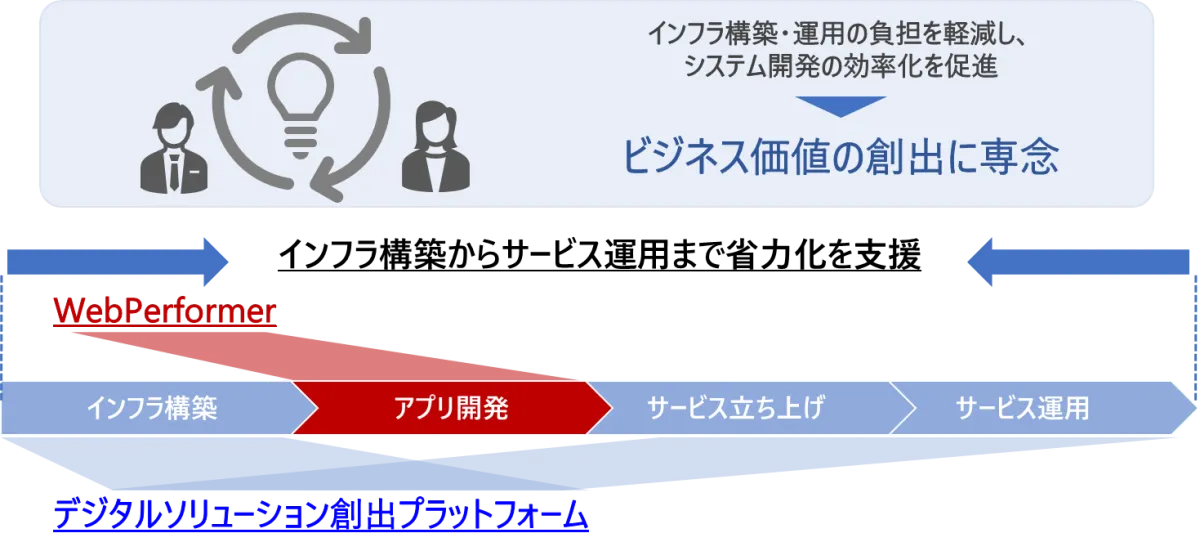 「デジタルソリューション創出プラットフォーム」はマネージドサービスとして提供されるため、利用者はインフラ管理の手間から解放されます。「WebPerformer」との組み合わせによって、アプリケーションの開発から運用までのスピードが飛躍的に向上します。これにより、要件に応じたアプリケーションをスピーディーに提供することができます。