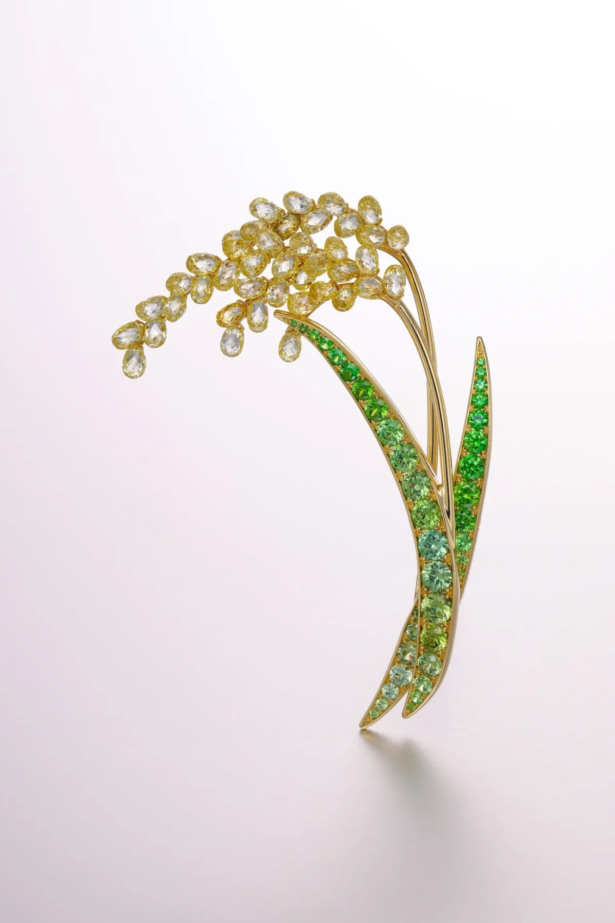 - - 稲穂ブローチ:この作品は18Kイエローダイヤモンドとデマントイドガーネットから作られており、収穫の喜びを感じさせます。