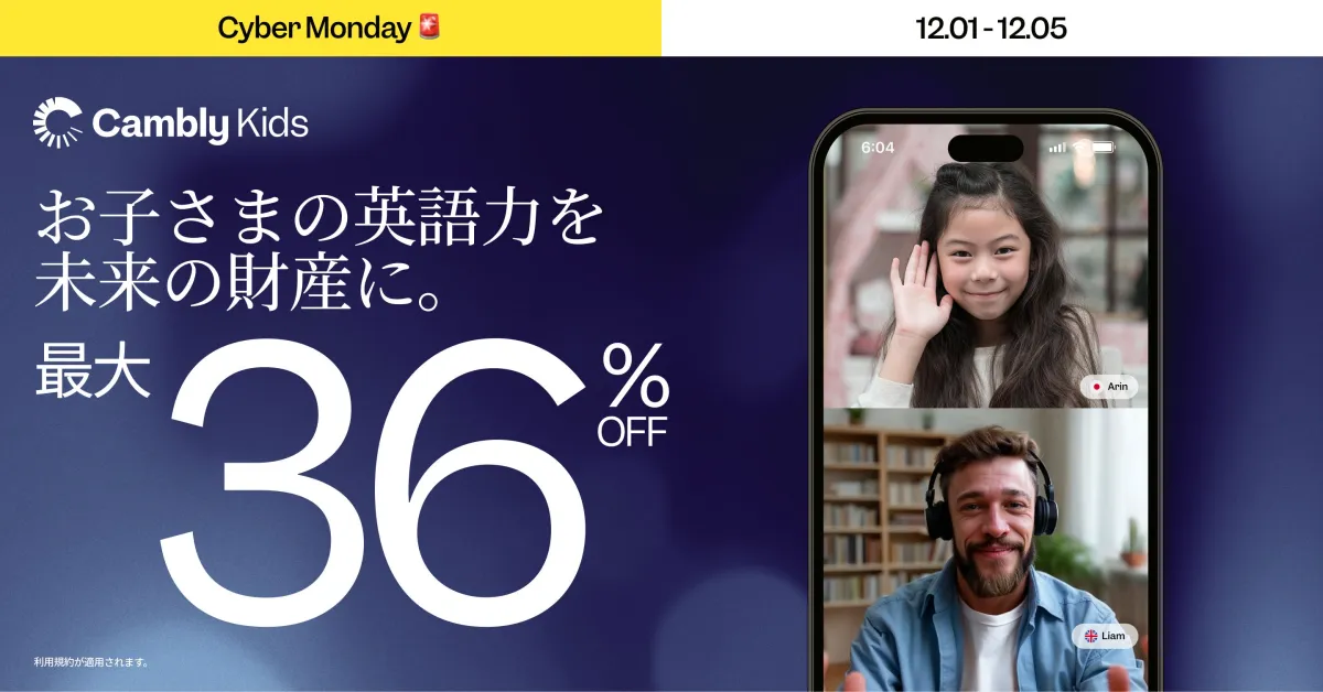 サンフランシスコ発のCambly Inc.が、2025年最後のCyber Mondayキャンペーンを発表しました。このキャンペーンは、12月1日(月)から12月5日(金)の5日間にわたり、お子さま向けに提供されるオンライン英会話サービス「Cambly Kids」の年間最大割引を提供します。プランには、12ヶ月プランが36%OFF(月額6,070円から利用可能)となる特別な割引が含まれています。英語学習を始めるには、絶好のチャンスです。