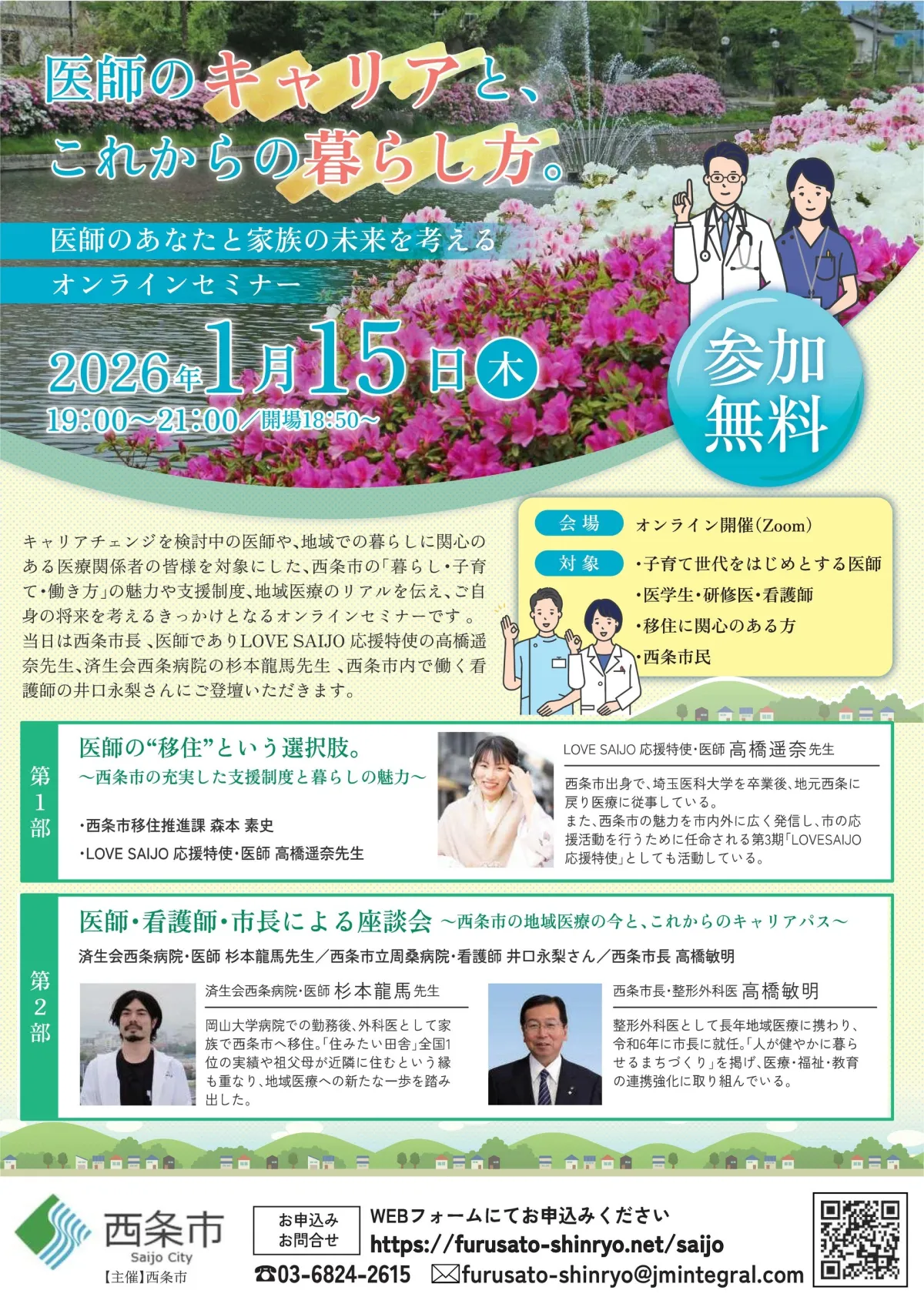 このセミナーは、オンラインで開催されるため、自宅にいながら参加可能で、医療従事者だけでなく、地域に関心のある方々も大歓迎です。日時は令和8年1月15日、午後7時から午後9時までの2時間です。参加は完全無料で、医師の移住についての具体的な情報や、西条市が提供する支援制度について学ぶことができます。