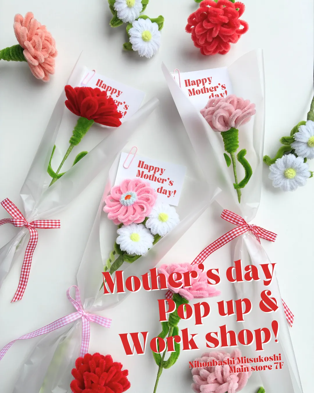 カーネーション作り: お好きなモールを使ってカーネーションを1から編む体験。こちらは25日のみ開催されます。スタッフが丁寧にサポートします。