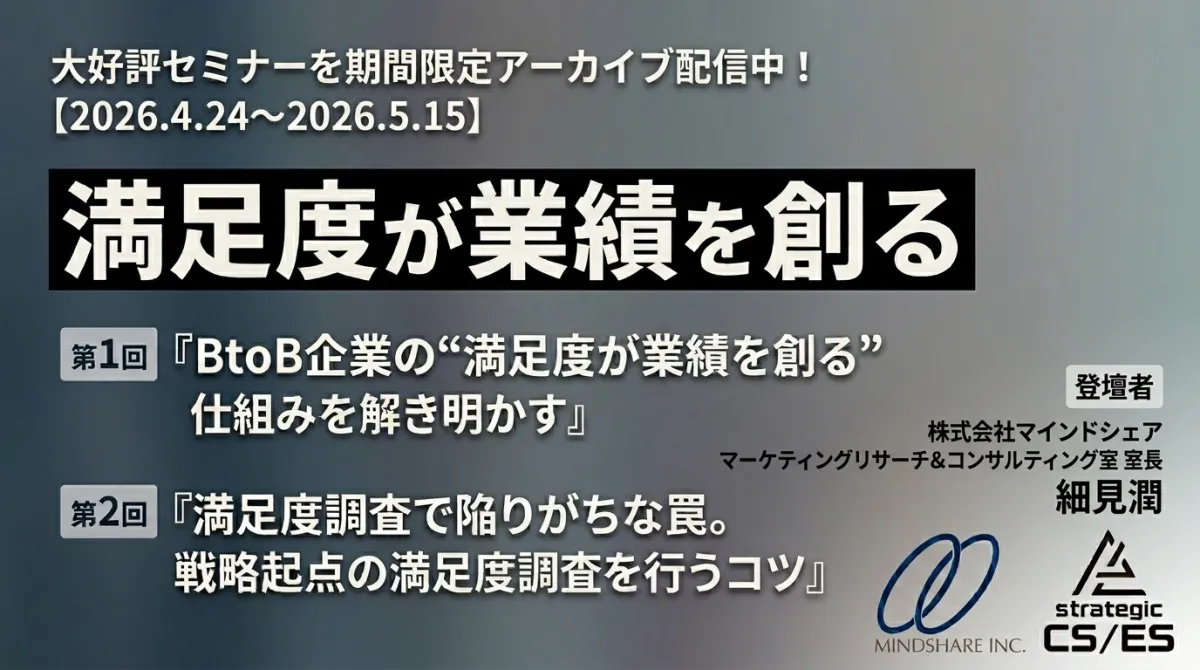 株式会社マインドシェアは、2023年度のBtoB企業向け無料オンラインセミナー『満足度が業績を創る』を4月24日から5月15日までの期間限定で配信します。このセミナーは、満足度を業績に結びつけるためのノウハウを学ぶための貴重な機会となります。