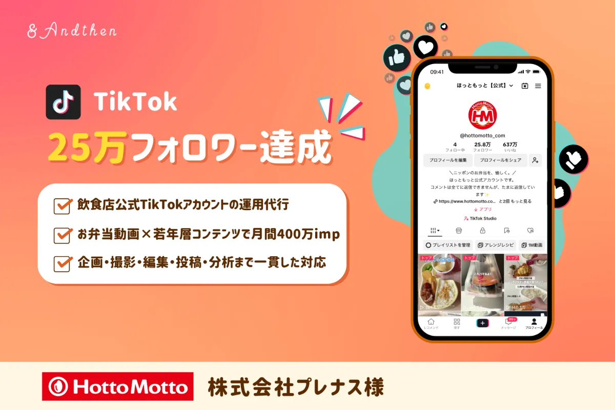 最近、弁当チェーン「ほっともっと」の公式TikTokアカウントが、アンドゼンの運用支援を経て25万人のフォロワーを達成しました。この成果は、若年層の顧客へのアプローチの一環として、エンターテインメント要素を取り入れた魅力的なコンテンツ発信によるものです。