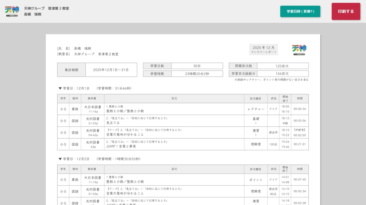 次に、この機能を通じて保護者とのコミュニケーションの質を向上させることができる点です。これまで口頭や手作業で行っていた学習状況の報告を、プロフェッショナルなレポートとして提示することが可能になります。子供の学習成果を具体的に共有することで、保護者の安心感と教育機関への信頼を高めることができ、学習状況を可視化することが可能となります。