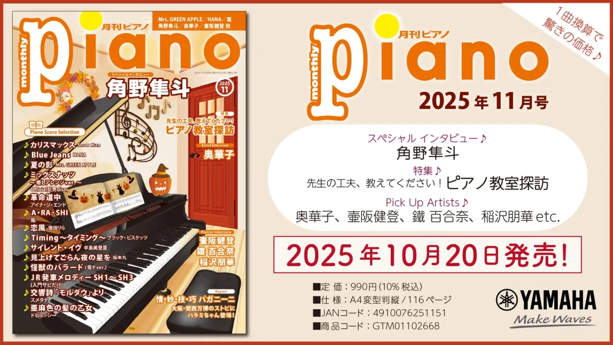 2025年10月20日発売の『月刊ピアノ 2025年11月号』では、今、ピアノ界で注目を集める角野隼斗さんへのスペシャルインタビューが掲載されています。国際的にも活躍する角野さんは、大きなコンサートやニューアルバムのリリースと、数多くのビッグニュースを次々と発信しています。特集のテーマは「先生の工夫、教えてください!ピアノ教室探訪」。これは、一般にはあまり知ることのできないピアノ教室の内情に迫る内容です。