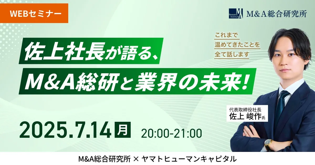 2025年7月14日、M&A業界で急成長を遂げた株式会社M&A総合研究所の代表取締役社長、佐上峻作氏が登壇するウェビナーが開かれます。このイベントはヤマトヒューマンキャピタル株式会社が主催し、オンラインで開催されるため、多くの方々が手軽に参加できます。