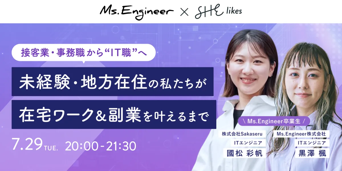 7月29日(金)、Ms.EngineerとSHEが共同で、未経験からエンジニア職へとキャリアチェンジを目指す女性を対象にしたITスキル習得イベントを開催します。このプログラムは、地方に住む女性や未経験者の皆さまが自由に働ける選択肢を広げることを目的としています。