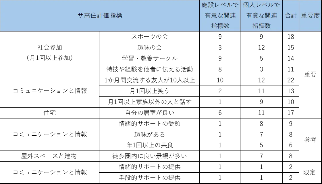 今回の研究では、39のサ高住施設からのデータを基に、生活環境を多角的に評価する「サ高住評価指標」を開発しました。分析の結果、月に1回以上の社会参加や、10人以上の友人との交流・家族外のコミュニケーションが重要な指標として浮かび上がりました。このほか、住宅環境の質、情緒的サポートの受領、趣味を持つことなども、評価において重要な役割を果たすことが示されました。