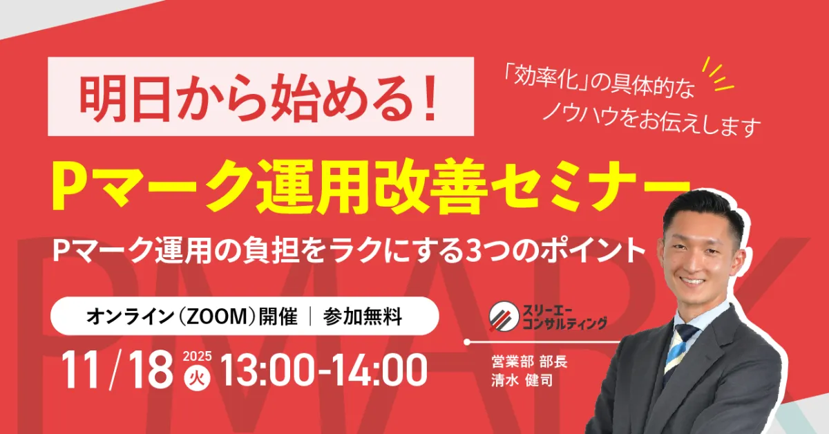株式会社スリーエーコンサルティングは、2025年11月18日(火)13:00から14:00に「明日から始める!Pマーク運用改善セミナー」を開催します。このオンラインセミナーは、プライバシーマークの運用を効率化したいすべての企業担当者に向けて設計されています。