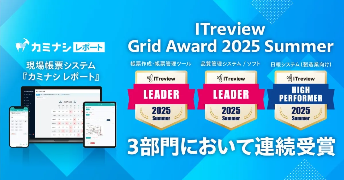 現場帳票システム『カミナシ レポート』が、アイティクラウド社主催の「ITreview Grid Award 2025 Summer」において、帳票作成・管理ツールと品質管理システムの2部門で最高位の「Leader」を、さらに日報システム(製造業向け)部門で「High Performer」を受賞しました。これは、カミナシが提供するサービスが利用者から強く支持されていることを示す重要な証しです。