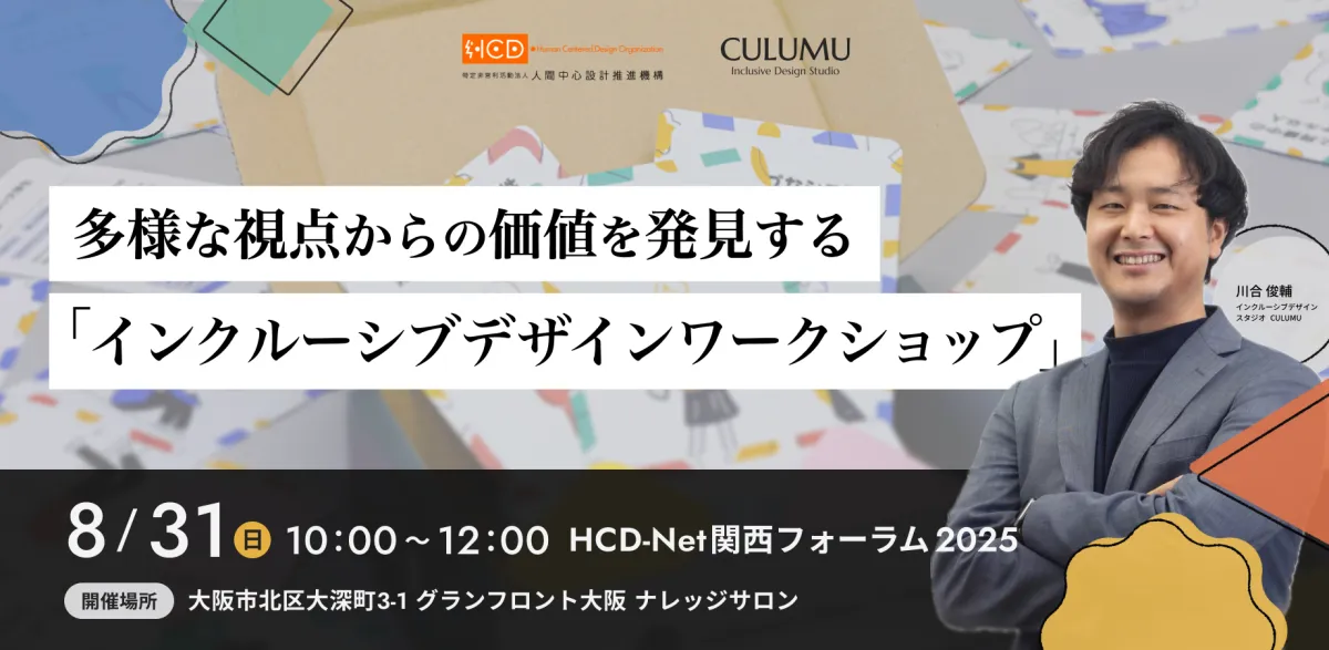 2025年8月31日(日)、大阪市のグランフロント大阪ナレッジサロンで、「HCD-Net関西フォーラム2025」が開催されます。このフォーラムでは、株式会社CULUMUのCDOである川合俊輔が「インクルーシブデザインワークショップ」を実施します。ワークショップでは、多様な視点からの課題発見と、それに基づくアイデア創出がテーマとなります。
