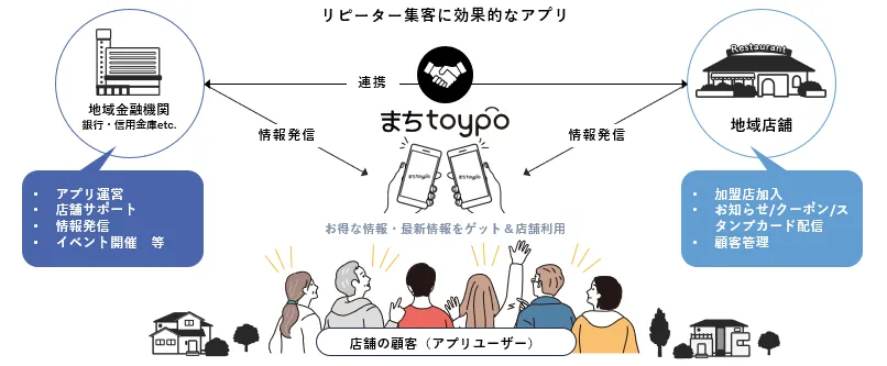 「茶々っとアプリ」は、地域店舗の活性化を目的とした集客サービス「まちtoypo™」をベースにしています。このサービスは、地域金融機関が店舗を取りまとめることで、相乗効果を生み出し、利用促進を狙っています。中小企業や小規模店舗に合わせたカスタマイズが可能で、利用者にとっても使いやすい工夫がされています。