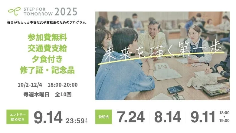 女子高校生の皆さんが未来に不安を感じず、自分の可能性を信じ、活躍するための一歩を踏み出すチャンスです。「STEP FOR TOMORROW」に参加して、同じ志を持つ仲間たちと共に自分の未来を一緒に見つけましょう。興味を持ったら、ぜひご応募を!
