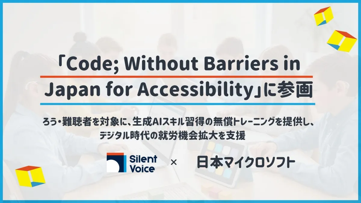 認定NPO法人Silent Voiceが、このたび日本マイクロソフトが提唱する社会貢献プログラム「Code; Without Barriers in Japan for Accessibility」(CWBJ-A)に参画します。この協働により、Silent Voiceは学習や就労に困難を抱えるろう・難聴者を対象に、最新のデジタル技術に関する無償トレーニングを提供します。てこのプログラムの一環として、参加者のデジタルリテラシー向上を目指し、AI時代における新たな就業機会の創出を支援します。