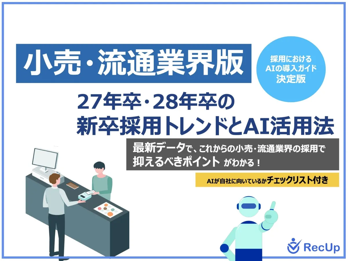 株式会社Delightが発表した新しい資料「【小売・流通業界向け】27年卒・28年卒の新卒採用トレンドとAI活用法」には、現時点での小売・流通業界における新卒採用の動向が詳しく説明されています。業界は激化する競争に直面しており、企業が選ばれるためには何が必要なのか、その解答を探るアプローチとしてAIの活用が挙げられています。
