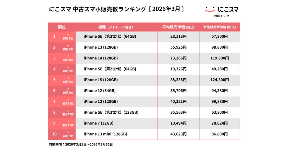 | 順位 | 機種(ストレージ容量) | 平均販売単価(前月比) |