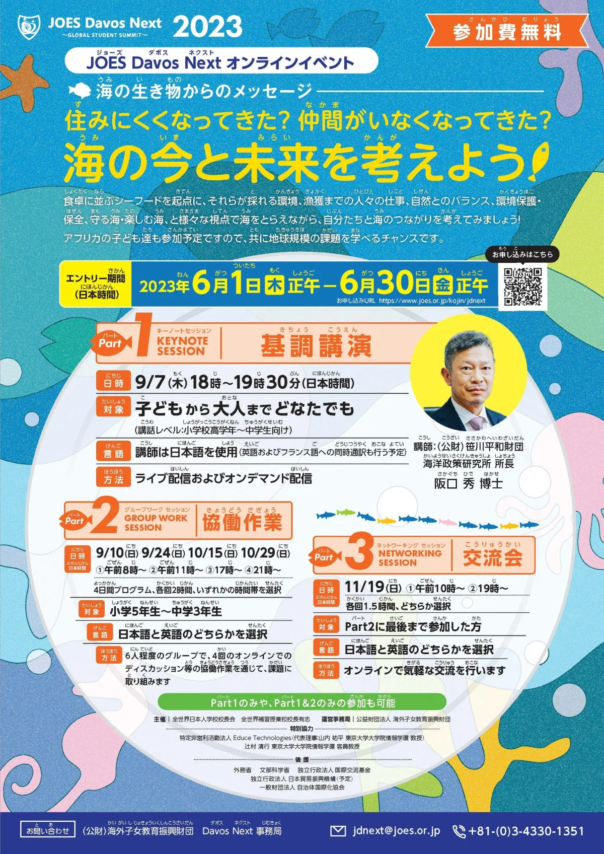今年度の「JOES Davos Next」プロジェクトに参加する機会が到来しました。このプロジェクトは、世界中の子どもたちが参加できる貴重なイベントです。今年の基調講演は、公益財団法人 笹川平和財団 海洋政策研究所の所長である阪口 秀博士を講師として迎えます。講演は9月7日に行われ、テーマは「海の生き物からのメッセージ ー 住みにくくなってきた?仲間がいなくなってきた?海の今と未来を考えよう!」です。このテーマは、現代の海洋環境が直面している深刻な問題を浮き彫りにしています。