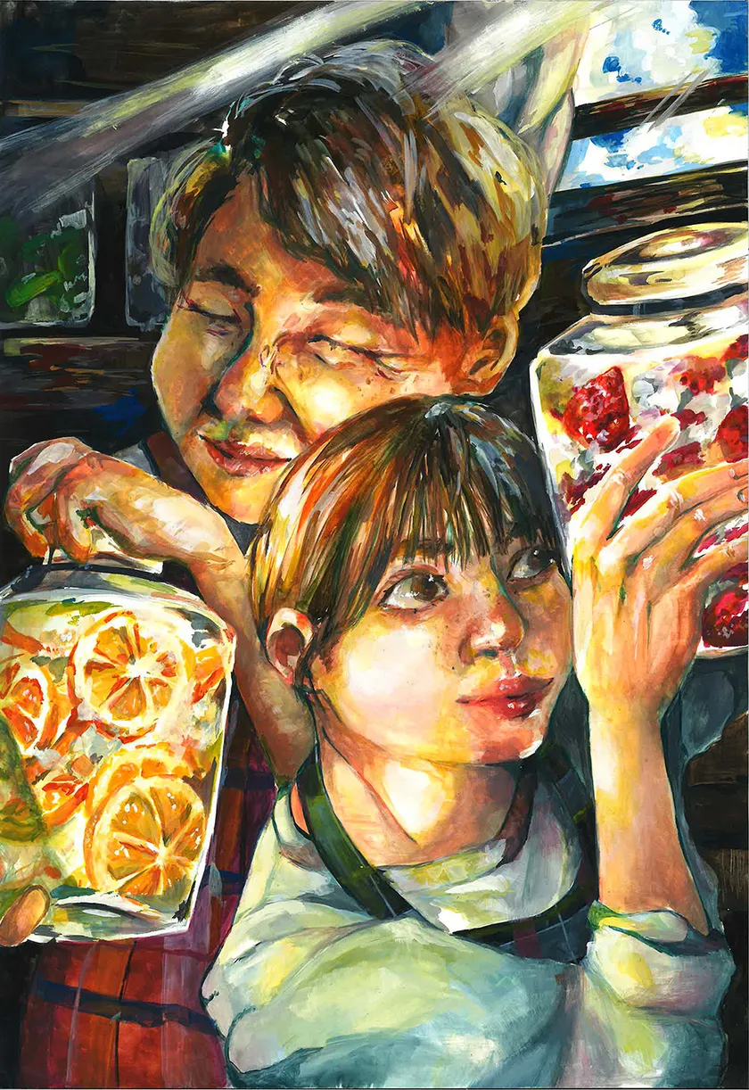 この審査の結果、最も優れた作品として文部科学大臣賞が中学生2名に授与されました。絵画部門の受賞者は、千葉県鎌ケ谷市在住の中学3年生、山口心花さんの「祖母とシロップ」となりました。心花さんの作品は、毎年おばあちゃんと一緒に作る果物のシロップの思い出を描いており、その色使いや描写からは、温かい家族の絆が感じられます。審査員からは、「油絵のような精密さで描かれている」と高い評価を得ています。