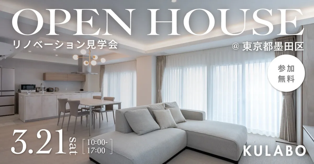 2026年3月21日、東京都墨田区において、株式会社sumarchが手掛けるリノベーションスタジオKULABOの見学会が開催されます。本イベントでは、実際にKULABOがリノベーションしたオーナー様のお住まいを直接見学することで、家づくりの具体的なアイデアやデザインの可能性を体感することができます。見学会に参加すれば、写真やカタログではわからない、素材の質感や空間の雰囲気をリアルに感じることができるでしょう。