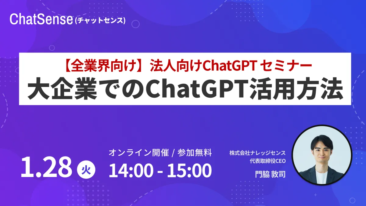 デジタルトランスフォーメーション(DX)の時代において、大企業が生成AIを導入することは、業務の効率化やセキュリティ対策において重要な鍵となります。そこで、本記事ではナレッジセンスが主催する無料オンラインセミナー、【全業界向け】大企業でのChatGPT活用方法についてご紹介します。