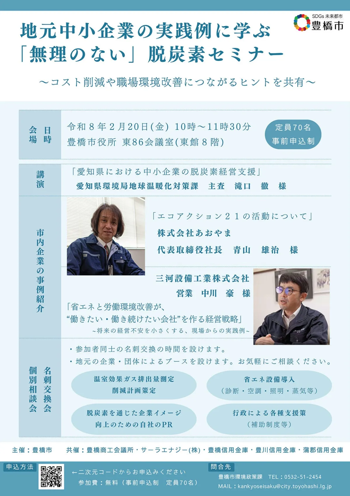 セミナーの特徴は、何といっても「無理のない」脱炭素経営に焦点を当てているという点です。脱炭素に取り組むことは、単に環境への配慮だけでなく、光熱費の削減や従業員が快適に働ける環境作りにもつながります。豊橋市やその周辺の企業が実際に実施している具体的な取り組み事例を紹介することで、参加者は自社にどのように取り組みを組み込むことができるかを理解できます。