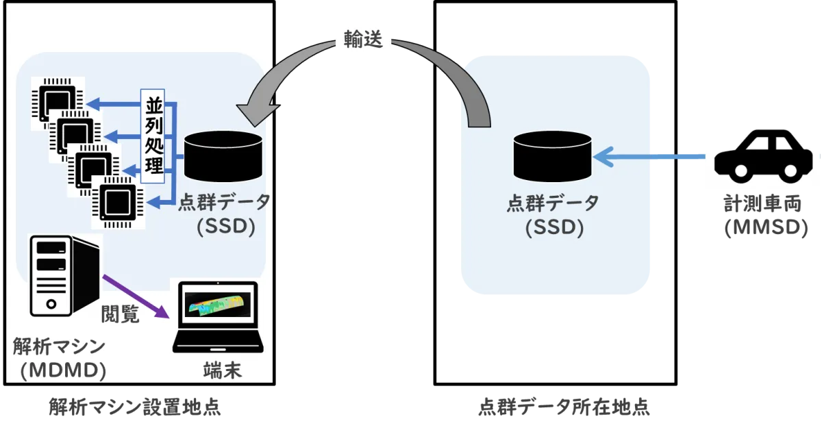 しかし、点群データは非常に大容量かつ複雑なため、従来のPC環境では容易には解析できません。データの送信に通常のインターネット回線を用いることは難しく、物理的にデータを転送する必要があるため、タイムラグが発生します。この問題を解決するために、両社はAPNの特徴を生かして遠隔解析を実現すべく取り組みました。