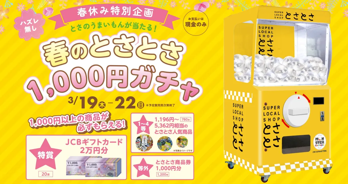 高知県のアンテナショップ「SUPER LOCAL SHOP とさとさ」が、2026年春に特別なイベントを開催します。その名も『春のとさとさ 1,000円ガチャ』。一般の方々が参加できるこのガチャイベントの目玉は、高さ2.0mを誇る巨大ガチャ「モンスターカプセル」です。