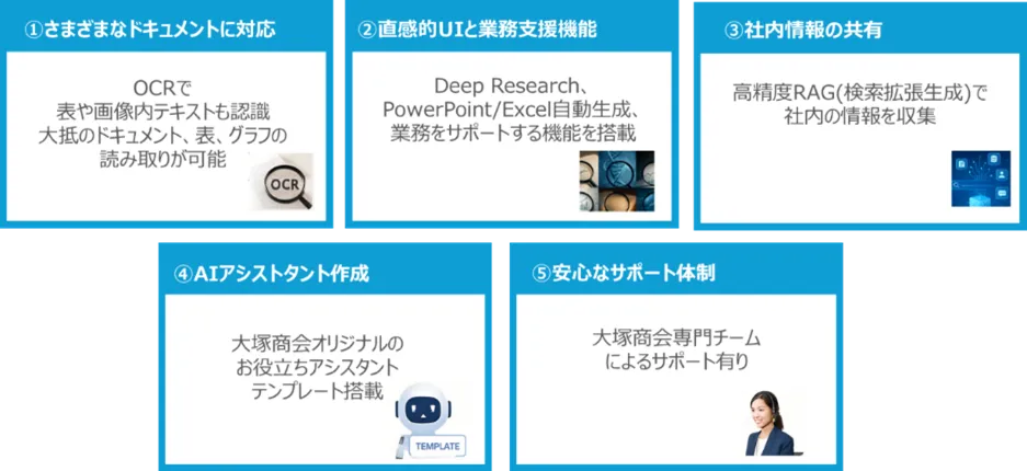 このサービスを利用する上での心強いポイントは、専任のサポートチームが存在することです。大塚商会の専門チームが、導入から利用に至るまでの各段階でトータルサポートを行います。困ったときにはすぐに相談できるため、初めての方でも安心してAIを導入できます。
