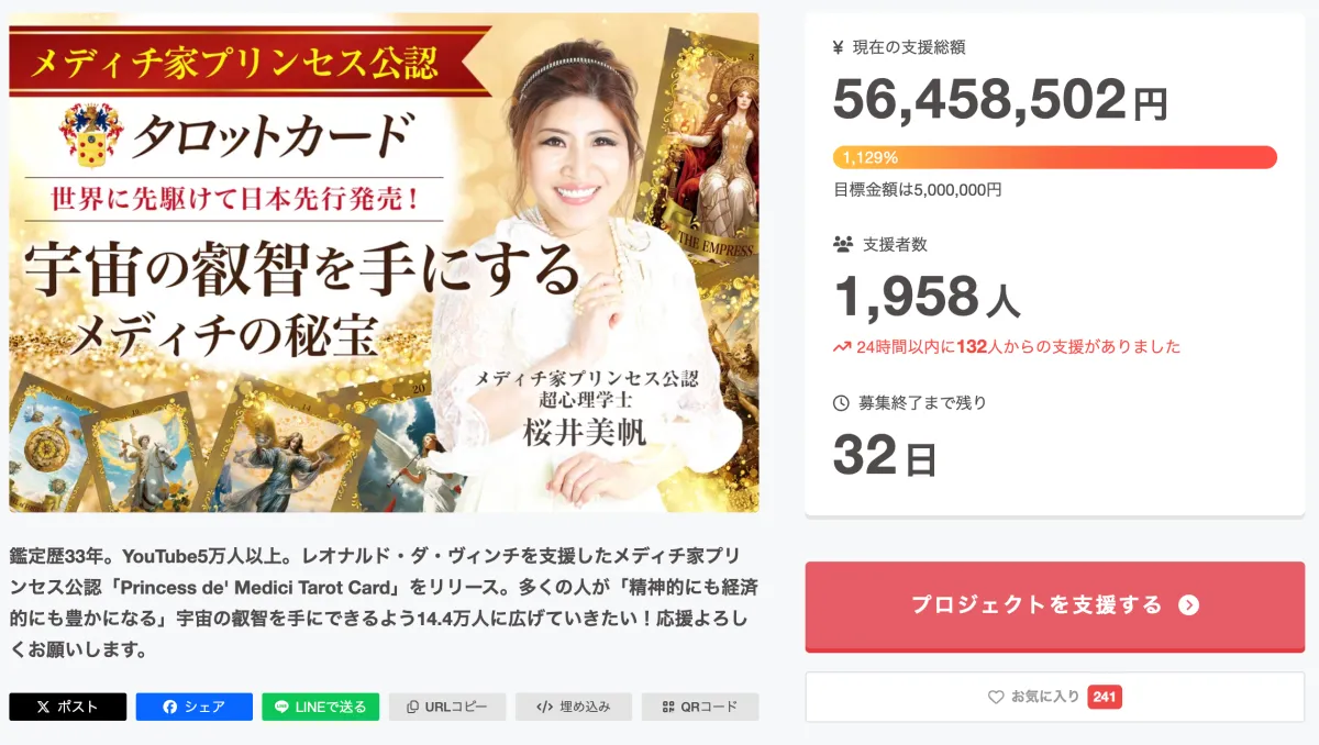 2025年10月10日に公開された「メディチ家プリンセス公認タロットカード」クラウドファンディングプロジェクトが、開始からわずか数週間で支援総額5,000万円を突破しました。この驚異的な成長により、CAMPFIREの日々のランキングでは総合1位を獲得し、スピリチュアル・アート分野の注目度が一層高まりました。