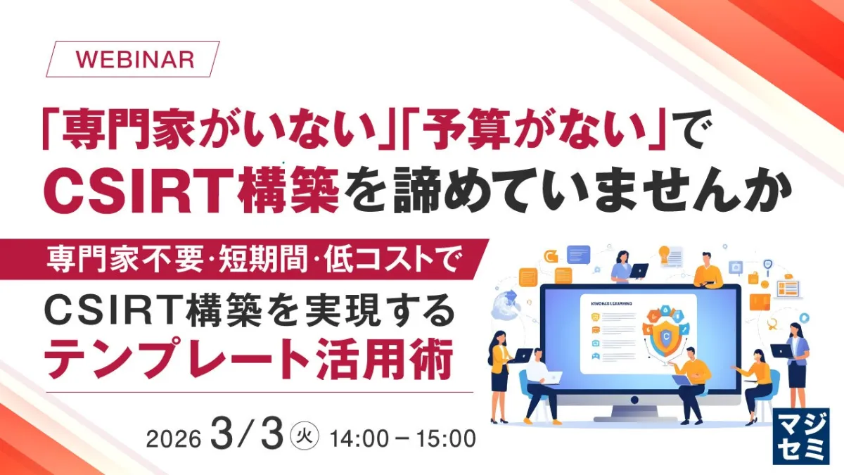 このような背景をふまえ、マジセミ株式会社では「専門家がいない」「予算がない」という理由でCSIRT構築を諦めてしまった企業向けに、具体的な解決策を提示するウェビナーを開催します。CSIRT構築は、単に人を集めることはもちろん、誰が何をどの順番で対応するのかを明確にする体制作りが求められます。
