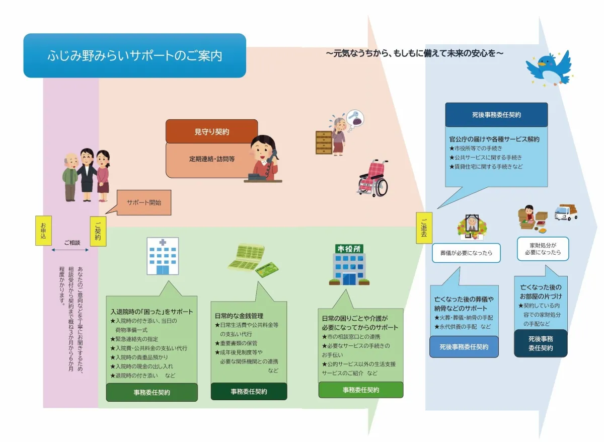 「ふじみ野みらいサポート」は、単身の65歳以上の高齢者を対象にした支援プログラムです。このプログラムでは、日常生活において安心して過ごせるよう、様々なサポート内容が用意されています。具体的には、見守り契約や事務委任契約、さらには死後事務委任契約といった形で、契約が結ばれます。