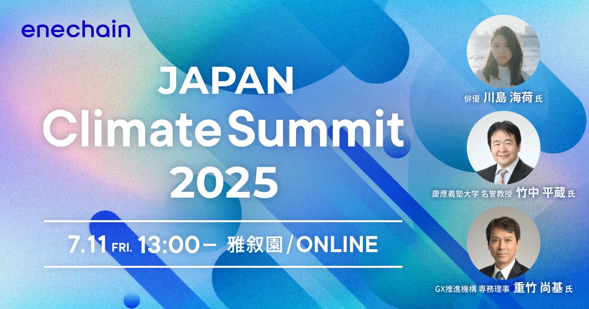 2025年7月11日(金)、株式会社enechainが主催するビジネスカンファレンス「JAPAN Climate Summit 2025 ―GXがもたらす社会や企業への変化とは―」が東京目黒区の雅叙園で開催されます。本イベントはオンライン配信も行い、参加費は無料です。