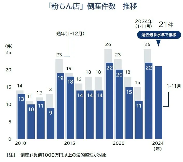 株式会社帝国データバンクが発表した調査結果によると、2024年以降、たこ焼きを含む「粉もん店」の倒産が増加しています。今年の11月までに、負債1000万円以上で法的整理を行った店舗が21件に達し、昨年の26件に遂行ペースは及ばないものの、依然として高い水準で推移しています。この流れは、今後ますます厳しくなる可能性があります。