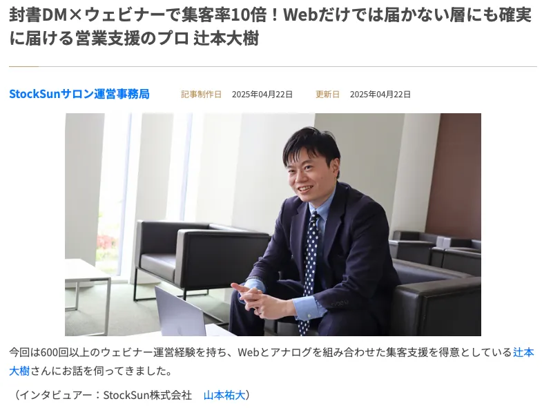 2025年4月22日、ショクサイ株式会社の代表取締役である辻本大樹氏が、国内最大級のフリーランス検索サイト「フリーランス名鑑」にインタビュー記事を掲載しました。このインタビューでは、ウェビナーを活用した効果的なマーケティング支援事業に焦点を当てており、特に「封書DM」を駆使した新たな集客方法が注目されています。
