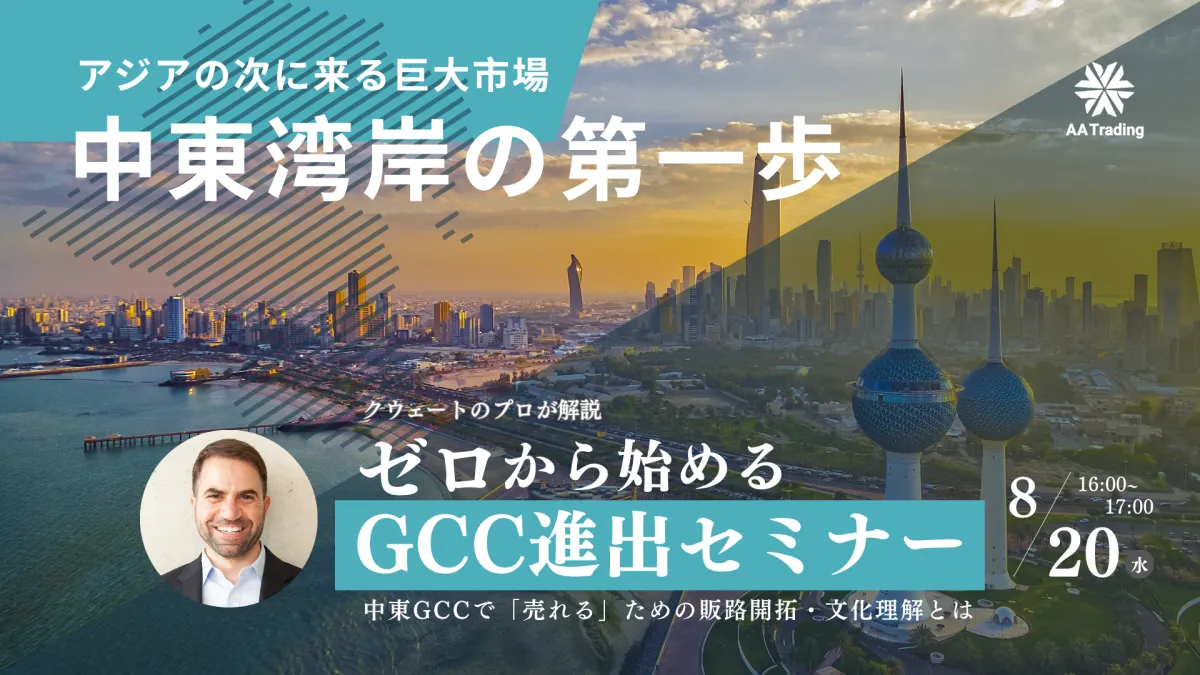 AA Trading株式会社(東京都港区、代表:谷口愛)が、2025年8月20日(水)に「ゼロから始めるGCC進出セミナー」を新たに開催します。本セミナーは、日本企業の中東・湾岸諸国(GCC)進出を支援することを目的としており、参加費は無料です。オンライン形式での実施で、定員は20名と限られていますので、興味のある方は早めの申し込みをお勧めします。