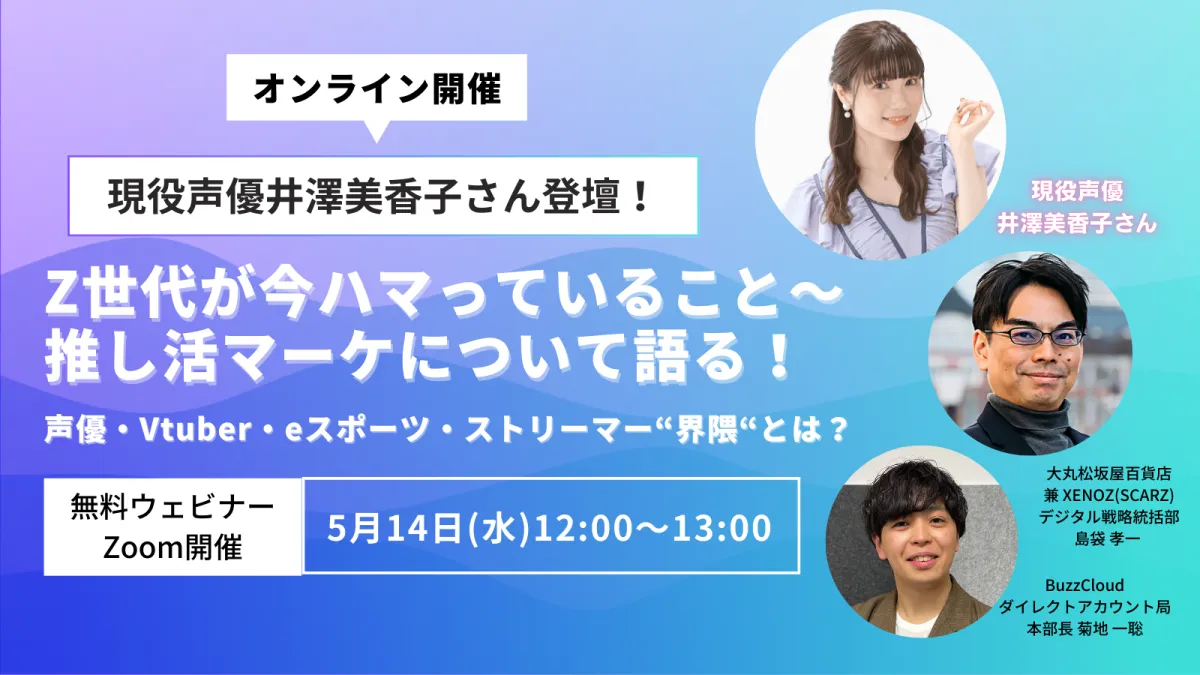2025年5月14日(水)12時から、BuzzCloud株式会社と大丸松坂屋百貨店が共同開催するウェビナー、「Z世代が今ハマっていること〜推し活マーケについて語る!」が行われます。本ウェビナーの特別ゲストとして、現役声優の井澤美香子さんが登壇し、Z世代が特に熱中している推し活文化について語ります。これは、声優やVtuber、eスポーツ、ストリーマーといった新たなインフルエンサーがどのように消費行動に影響を与えているのかを学ぶ貴重な機会です。