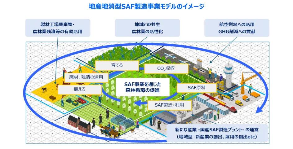 地域密着型のSAF事業を立ち上げることで、その土地でとれた木材を現地で利用する地産地消モデルが実現し、SAFの供給が広がるだけでなく、地域活性化にも寄与することが期待されます。また、国産木材を利用することによって、森林資源の適切なサイクル活用が進み、持続可能な森林経営への貢献も目指しています。