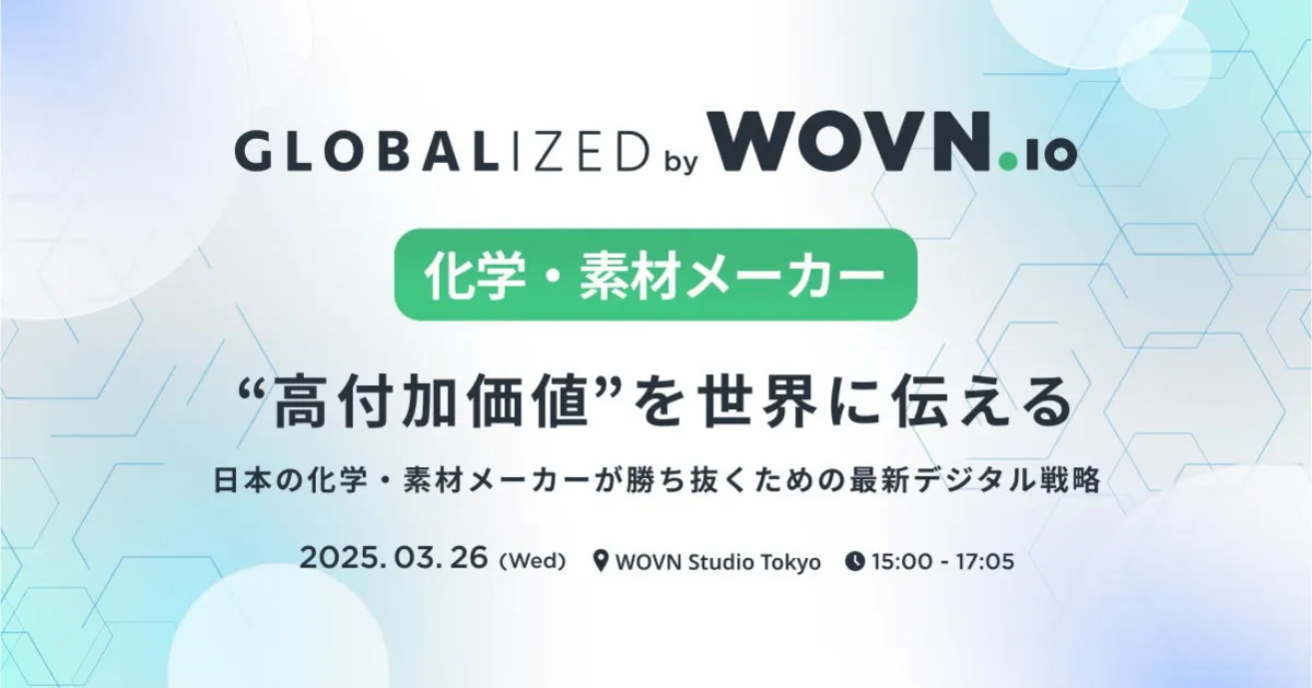 2025年3月26日、Wovn Technologies株式会社が主催するカンファレンス「GLOBALIZED by WOVN.io」が開催されます。今回のテーマは「高付加価値を世界に伝える」。特に日本の化学・素材メーカーが、グローバル市場で競争力を発揮するための最新デジタル戦略が紹介されます。