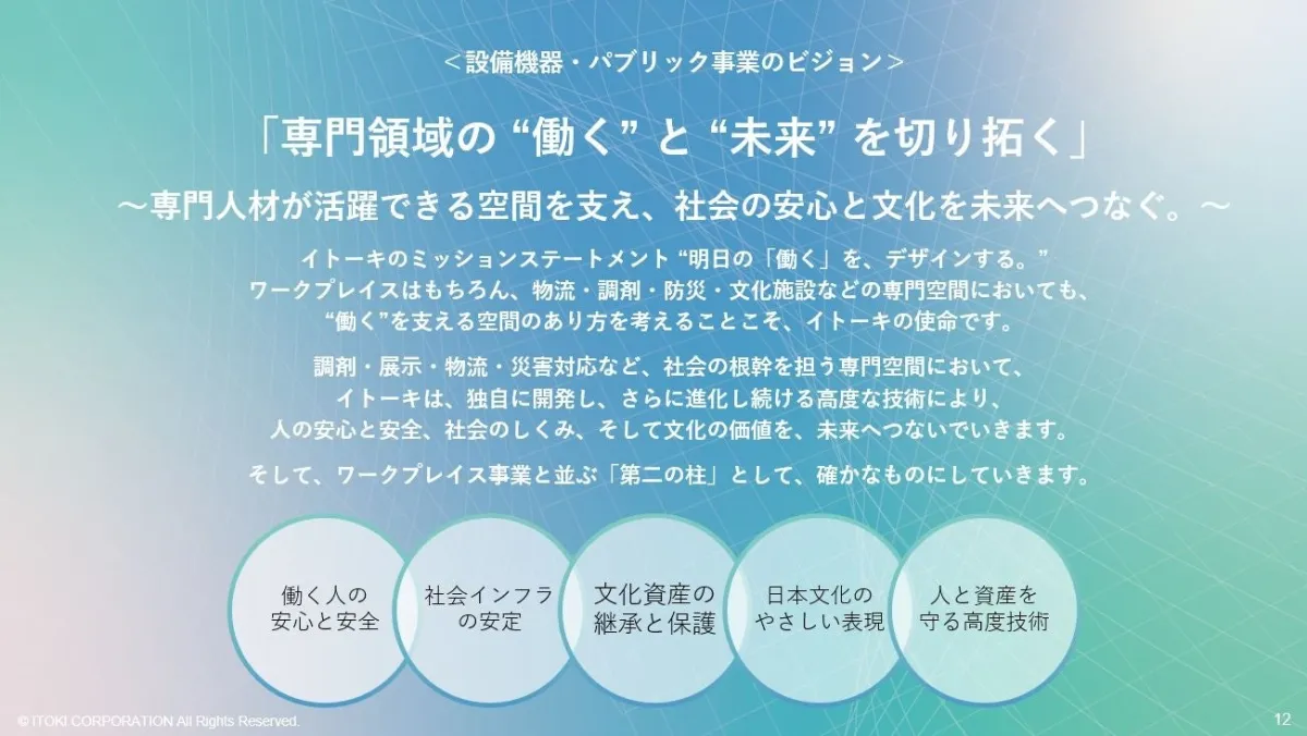 新ビジョンの核となるのは、物流や調剤、文化施設、さらには災害対応といった多様な専門領域において、如何に設備で「働く」を支えるかという点です。イトーキは、「働く」という行為が果たす役割を再認識し、社会課題を解決しつつ新たな価値を創出していくことを目指しています。このビジョンは、単なるサービスの拡充ではなく、社会と文化を支えるインフラの構築に対する深い責任感を反映しています。