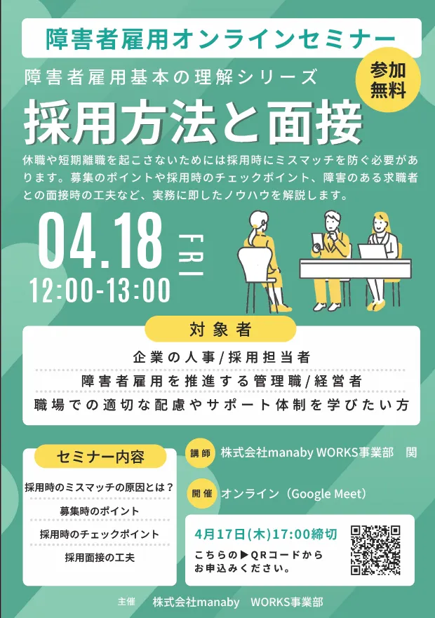 株式会社manaby(マナビー)は、障害者雇用の現場において、画期的なオンラインセミナーを2025年4月18日(金)に開催します。このセミナーは、障害者雇用に取り組む企業や団体の経営者、人事担当者にとって、必見の内容となっています。
