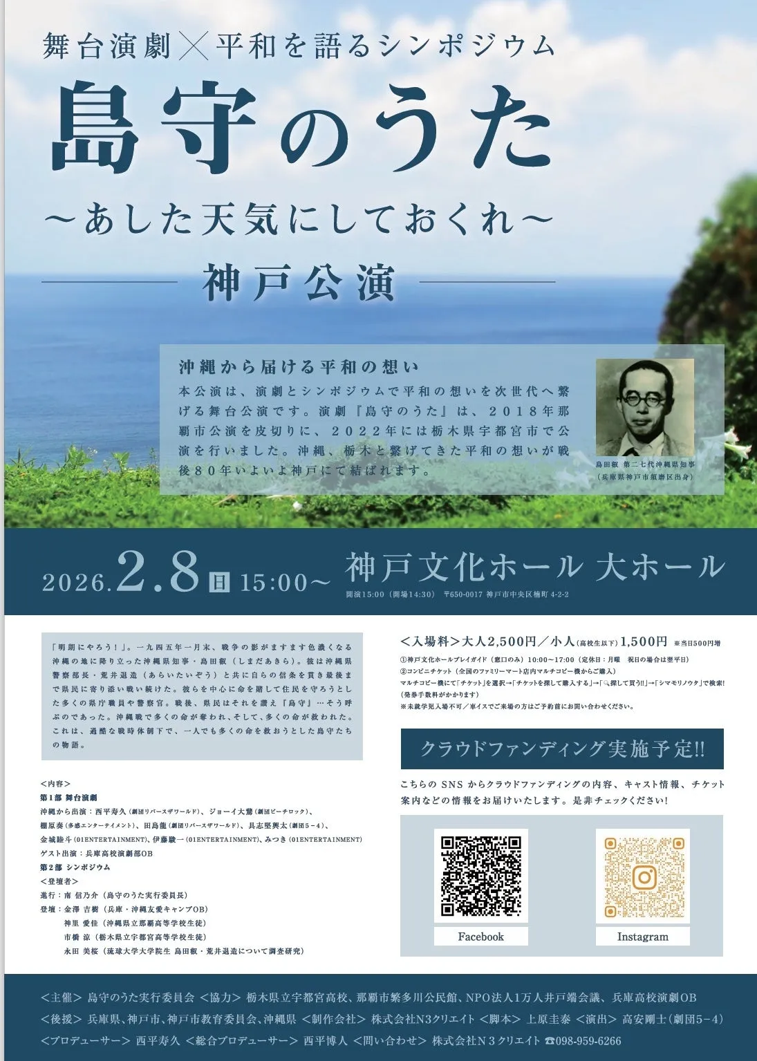 この舞台とシンポジウムは、一回限りの公演で、2月8日15時から神戸文化ホール(大ホール)にて開催されます。主催は島守のうた実行委員会であり、兵庫県、神戸市、神戸教育委員会、沖縄県、そして兵庫県青少年本部と後援がついています。