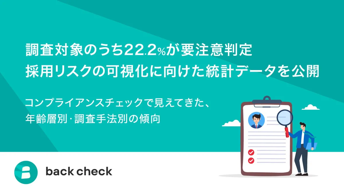 株式会社ROXXが提供するオンライン完結型リファレンス及びコンプライアンスチェックサービス『back check』が、最近実施したリサーチの統計データを公開しました。今回の調査では、調査対象者全体の中で22.2%が『要注意』という判定を受けました。具体的には、懸念あり(B判定)が20.0%、重要な懸念あり(C判定)が2.2%という結果でした。つまり、約5人に1人のペースでコンプライアンスに関連するリスクが存在することが明らかになりました。