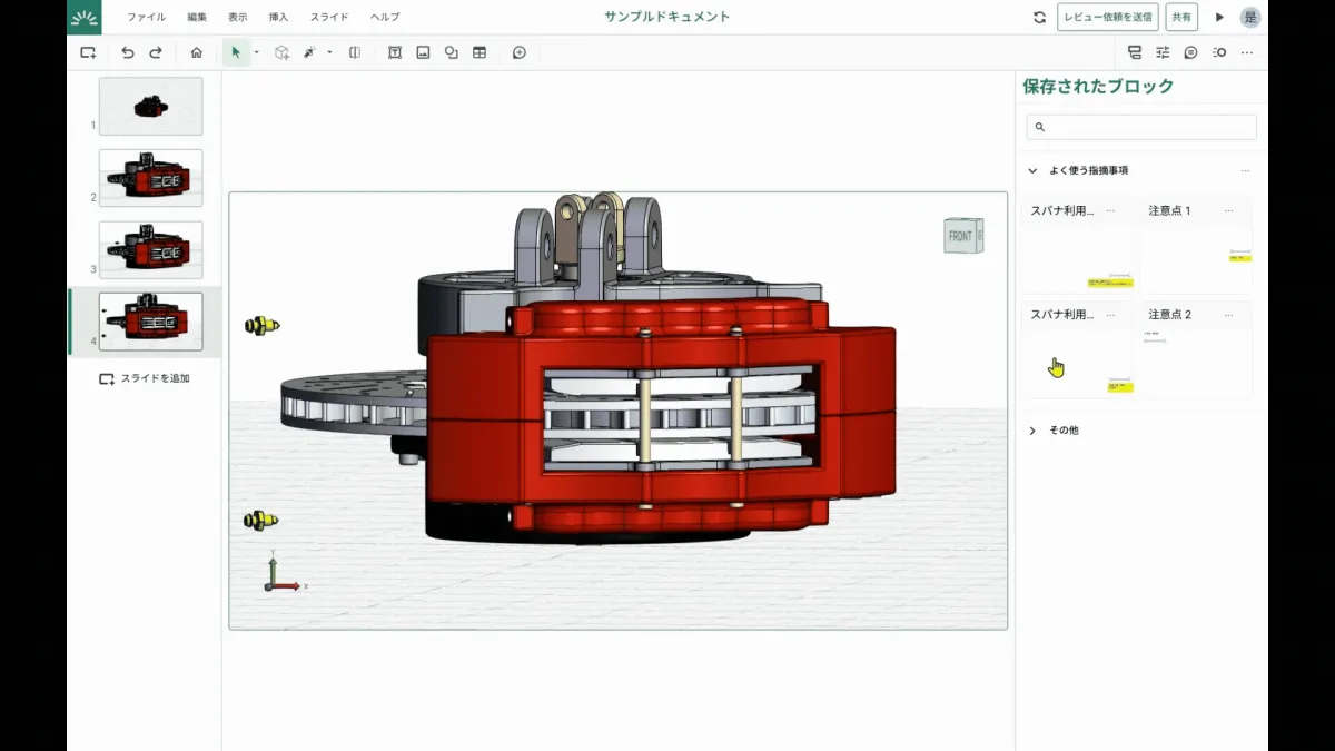 「3D Docs」は、3次元CADデータを簡単に扱うことができ、情報伝達の効率化を実現するツールです。初めての方でも扱いやすく、アニメーション付きでの資料作成が可能です。これにより、製造現場のコミュニケーションを円滑にし、統合された情報共有を実現します。