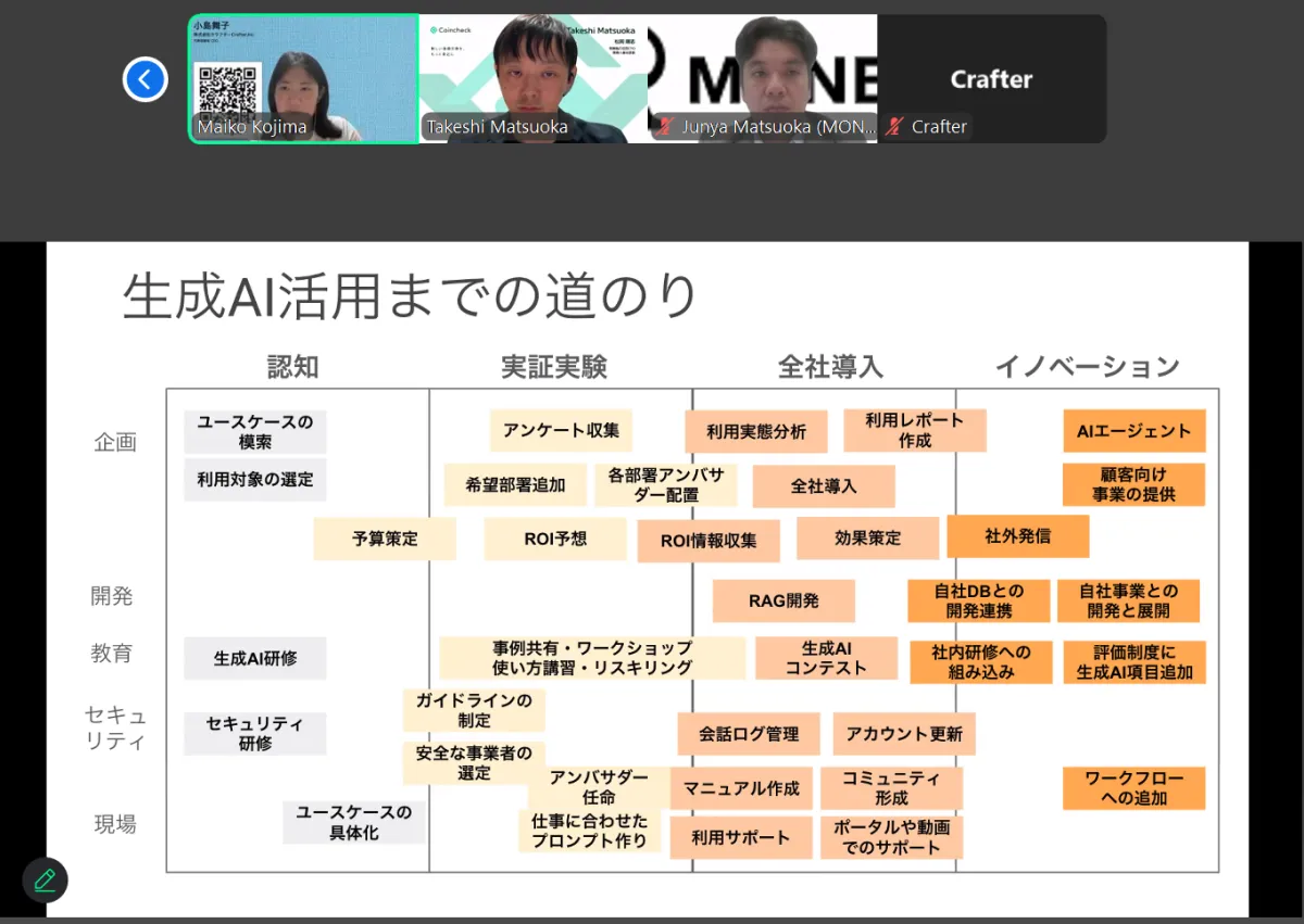 参加者たちは、AIを社内でどのように普及させるか、またその際に直面する課題についても話し合いました。AIの定着に成功するためのポイントや試行錯誤のプロセスは、今後AIを導入しようと考えている企業担当者にとって非常に有益な情報です。