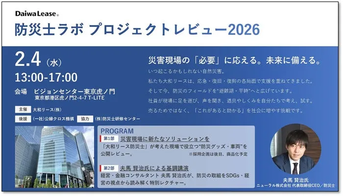 2026年2月4日、大和リース株式会社は防災士有資格者による社内プロジェクト「防災士ラボ」の成果を発表するイベント「プロジェクトレビュー2026」を東京・虎ノ門で開催します。このイベントは、単なる社内発表を超え、外部有識者や関係団体、メディアを交えた形式で行われ、多様な視点から評価されることが特徴です。