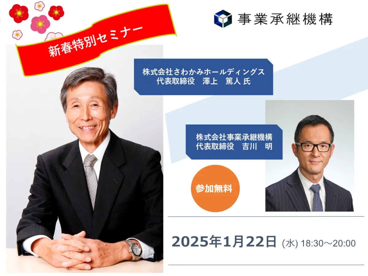 株式会社事業承継機構は、2025年1月22日(水)に新春特別セミナーを開催します。このセミナーでは、株式会社さわかみホールディングスの代表取締役である澤上篤人氏をゲストスピーカーとして迎え、事業承継に関する重要なテーマを取り上げます。セミナーは、東京都千代田区にある同機構の本社4階で行われ、参加費は無料です。ただし、事前登録が必要ですのでご注意ください。